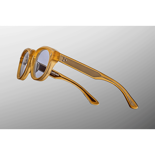 10mm Cured Cellulose Acetate Frame In Semi-Translucent Orange, With Custom Double-Laminated Temples Composed Of Clear Beige Exteriors And Semi-Translucent Orange Interiors, Complemented By Armorlite 4-Base Lenses In Marian Blue With Backside Anti-Reflective Treatment
